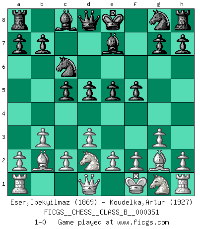 Last move : 1-0 2022 April 1 18:58:6 [Event "FICGS__CHESS__CLASS_B__000351"] [Site "FICGS"] [Date "2022.02.06"] [Round "1"] [White "Eser,Ipekyilmaz"] [Black "Koudelka,Artur"] [Result "1-0"] [WhiteElo "1869"] [BlackElo "1927"] 1.g3 d5 2.Bg2 c5 3.Kf1 e5 4.b3 Be7 5.Bb2 Nc6 6.d3 f5 7.Nd2 1-0 This chess game has been lost on time (started : 2022.02.06 15:43:44) Benko's Opening Player White won this chess game. Follow this game move after move (download)It is difficult to play against Einstein's theory --on his first loss to Fischer. (Mikhail Tal) Ich hatte meine größten Erfolge, als ich 47 Jahre alt war. Kasparow war noch nicht mal 42 und hat das Schach schon im Stich gelassen. (Viktor Kortschnoi) Los asuntos humanos son como una partida de Ajedrez: solo aquellos que no lo toman seriamente, pueden ser llamados buenos jugadores. (Hung Tzu Ch'eng) Les sacrifices démontrent seulement que quelqu'un a gaffé. (Savielly Tartacover) The arrogant army will lose certainly the battle. (Chinese proverb)