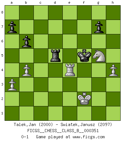 Last move : 0-1 2022 June 4 12:18:29 [Event "FICGS__CHESS__CLASS_B__000351"] [Site "FICGS"] [Date "2022.02.06"] [Round "1"] [White "Talek,Jan"] [Black "Swiatek,Janusz"] [Result "0-1"] [WhiteElo "2000"] [BlackElo "2097"] 1.c3 Nf6 2.d4 d5 3.Nf3 e6 4.Bf4 c5 5.e3 Nc6 6.Nbd2 Bd6 7.Bg3 O-O 8.Bd3 b6 9.Qe2 Bb7 10.Rd1 Ne7 11.O-O Qc7 12.Bxd6 Qxd6 13.Ne5 Qc7 14.Qf3 Rad8 15.Qh3 h6 16.f3 Ne8 17.f4 Nd6 18.Rfe1 Ne4 19.Bc2 Nd6 20.Qh5 Bc6 21.Qh3 Bb7 22.Bb1 Ne4 23.a3 Ba8 24.Re2 Qc8 25.g4 f6 26.Nd3 Bc6 27.Rg2 Be8 28.Nxe4 dxe4 29.Nf2 cxd4 30.cxd4 e5 31.Nxe4 Bc6 32.f5 exd4 33.exd4 Rfe8 34.Re2 Qd7 35.Qg3 Kh8 36.h4 h5 37.g5 Nxf5 38.Qf3 fxg5 39.Qxh5+ Kg8 40.d5 Qf7 41.Qxf7+ Kxf7 42.Nxg5+ Kf6 43.Bxf5 Rxe2 44.Rf1 Rxd5 45.Bd3 Ke7 46.Bxe2 Rd2 47.Re1 Kf6 48.Bh5 Kf5 49.Rf1+ Ke5 50.Bf3 Bd5 51.Re1+ Kf4 52.Bxd5 Rxd5 53.Kf2 Rb5 54.Re4+ Kf5 55.b4 Rd5 0-1 Saragossa Opening Kingside Castling by player Black (move 7) Kingside Castling by player White (move 11) Player Black won this chess game. Follow this game move after move (download)The passed Pawn is a criminal, who should be kept under lock and key. Mild measures, such as police surveillance, are not sufficient. (Aaron Nimzovich) Die Idee von Capablanca, Schach als Fach in den Schulen zu lehren, ist großartig. (Fidel Castro) En la perfecta combinación de Ajedrez como en una historia corta de primera clase, toda la trama y contra trama deberá conducir hacia un final sorprendente, el interes no es mitigado hasta el último momento. (Yates and Winter) On a dit que l'homme se distingue de l'animal par le fait qu'il achète plus de livres qu'il ne peut en lire. Je voudrais suggérer qu'inclure à la liste des livres quelques livres d'échecs rendrait la distinction manifeste. (Edward Lasker) Indecision is the key to flexibility. (Unknown)