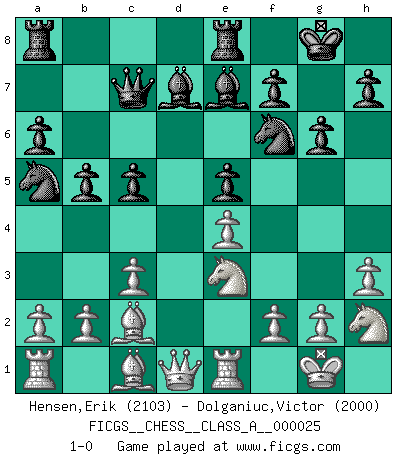 Last move : 1-0 2007 November 2 12:6:30 [Event "FICGS__CHESS__CLASS_A__000025"] [Site "FICGS"] [Date "2007.07.29"] [Round "1"] [White "Hensen,Erik"] [Black "Dolganiuc,Victor"] [Result "1-0"] [WhiteElo "2103"] [BlackElo "2000"] 1.e4 e5 2.Nf3 Nc6 3.Bb5 a6 4.Ba4 Nf6 5.O-O Be7 6.Re1 b5 7.Bb3 d6 8.c3 O-O 9.h3 Na5 10.Bc2 c5 11.d4 Qc7 12.Nbd2 Bd7 13.Nf1 Rfe8 14.Ne3 g6 15.dxe5 dxe5 16.Nh2 1-0 Ruy Lopez : Closed Kingside Castling by player White (move 5) Kingside Castling by player Black (move 8) Player White won this chess game. Follow this game move after move (download)Why must I lose to this idiot ? (Aron Nimzovich) Mutter, ich bin eben Ex-Weltmeister geworden. --beim nach Hause Kommen nach dem Verlust des WM-Titels an Mihail Botvinnik -- (Mikhail Nekhemyevich Tal) La vida es como un juego de Ajedrez, cambiando con cada movimiento. (Proverbio Chino) Psychologiquement, tu dois avoir confiance en toi même, mais cette confiance doit être basée sur des faits. (Robert Fischer) Thus, what is of supreme importance in war is to attack the enemy's strategy. (Sun Tzu)