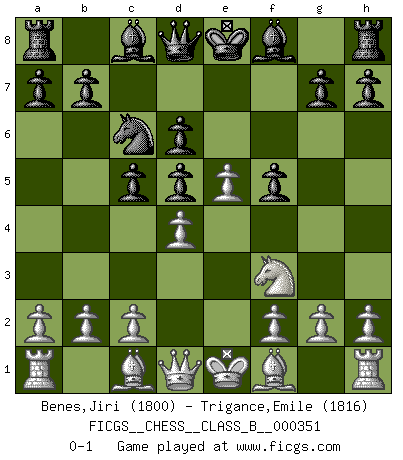 Last move : 0-1 2022 March 25 1:36:20 [Event "FICGS__CHESS__CLASS_B__000351"] [Site "FICGS"] [Date "2022.02.06"] [Round "1"] [White "Benes,Jiri"] [Black "Trigance,Emile"] [Result "0-1"] [WhiteElo "1800"] [BlackElo "1816"] 1.e4 c5 2.Nf3 Nf6 3.e5 Nd5 4.Nc3 e6 5.Ne4 f5 6.Nc3 Nc6 7.Nxd5 exd5 8.d4 d6 0-1 This chess game has been lost on time (started : 2022.02.06 15:43:44) Sicilian : Nimzovich-Rubinstein variation Player Black won this chess game. Follow this game move after move (download)When the Chess game is over, the Pawn and the King go back to the same box. (Irish saying) Früher wurde jeder komplizierte Zug, jedes interessante Opfer mit großem Beifall und Enthusiasmus aufgenommen. Heute schaltet man einfach seinen Fritz an, und man kann sehen, was los ist, ob der Zug geht oder nicht. (Vladimir Kramnik) Bobby Fischer es el mas grande genio de Ajedrez de todos los tiempos. (Alexander Kotov) Plusieurs personnes se sont demandées comment Tal faisait pour gagner... En fait, c'est très simple ! Il met ses pièces au centre de l'échiquier et les sacrifie quelque part ! (David Bronstein) See no evil, hear no evil, speak no evil. (The 3 monkeys)