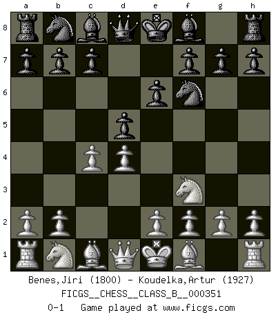 Last move : 0-1 2022 April 27 18:15:17 [Event "FICGS__CHESS__CLASS_B__000351"] [Site "FICGS"] [Date "2022.02.06"] [Round "1"] [White "Benes,Jiri"] [Black "Koudelka,Artur"] [Result "0-1"] [WhiteElo "1800"] [BlackElo "1927"] 1.d4 d5 2.c4 e6 3.Nf3 Nf6 0-1 This chess game has been lost on time (started : 2022.02.06 15:43:44) Queen's gambit declined Player Black won this chess game. Follow this game move after move (download)The stomach is an essential part of the Chess master. (Bent Larsen) Eine Person mit durchschnittlichem IQ kann etwa eine ELO von 2000 erreichen. (Jonathan Levitt) Siempre es mejor sacrificar los hombres de tu oponente. (Savielly Tartakower) Il n'y a pas eu de défaite parce que je ne crois pas que cet ordinateur ait jamais existé. IBM a triché en refusant d'imprimer les modes de recherche de la machine. C'est évident, pendant le match, des coups décisifs ont été joués par des êtres humains. Aujourd'hui, les meilleurs spécialistes en informatique ne peuvent toujours pas expliquer comment Deep-Blue a pu jouer contre la logique des ordinateurs. IBM a gagné une guerre de communication, mais ils sont incapables de prouver que l'ordinateur a gagné tout seul. (Garry Kasparov) Life is like internet, nothing interesting, but noone want to leave it. (Ilmars Cirulis)