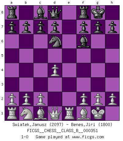 Last move : 1-0 2022 March 25 14:47:7 [Event "FICGS__CHESS__CLASS_B__000351"] [Site "FICGS"] [Date "2022.02.06"] [Round "1"] [White "Swiatek,Janusz"] [Black "Benes,Jiri"] [Result "1-0"] [WhiteElo "2097"] [BlackElo "1800"] 1.e4 e5 2.Nf3 Nc6 3.Bb5 Nf6 4.O-O Nxe4 5.Re1 Nd6 6.Nxe5 Be7 7.Bf1 Nxe5 8.Rxe5 O-O 9.d4 Bf6 10.Re1 1-0 This chess game has been lost on time (started : 2022.02.06 15:43:44) Ruy Lopez : Berlin defense, Open variation Kingside Castling by player White (move 4) Kingside Castling by player Black (move 8) Player White won this chess game. Follow this game move after move (download)Fischer is under obligation to nobody. (Joseph Platz) Ein bischen Romantik kann weder im Schach noch in der Liebe schaden. Also versuche ich mich ab und zu daran zu erinnern. (Nigel Short) Aquellos que dicen entender al Ajedrez, no entienden nada. (Robert Hubner) Mon pion favori sur ma case favorite ! Bronstein en parlant d'un coup de pion en h5 quand il avait les Noirs. God, you are such an idiot. - Actually, I thought I was more of a jerk. (Gregory House to Stacy Warner, House M.D.)