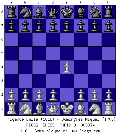 Last move : 1-0 2022 March 10 2:37:0 [Event "FICGS__CHESS__RAPID_B__000374"] [Site "FICGS"] [Date "2022.02.07"] [Round "1"] [White "Trigance,Emile"] [Black "Domingues,Miguel"] [Result "1-0"] [WhiteElo "1816"] [BlackElo "1700"] 1.e4 1-0 This chess game has been lost on time (started : 2022.02.07 1:26:35) King's pawn Opening Player White won this chess game. Follow this game move after move (download)A bad plan is better than none at all. (Frank Marshall) Dein Körper muss in Topform sein. Dein Schach verfällt, wenn dein Körper verfällt. Der Körper kann nicht vom Geist getrennt werden. (Robert James Fischer) Botvinnik trató de alejar el misterio referente al Ajedrez, siempre relacionandolo a situaciones de la vida diaria. Solía llamar al Ajedrez un problema inexacto típico, similar a aquellos en que la gente tiene siempre que resolver a cada día. (Garry Kasparov) Les Echecs sont et restent toujours un combat, un combat intégral comme la boxe, la lutte ou un autre sport, et où il doit y avoir un vainqueur et un vaincu. (Joseph Emil Diemer) A clear conscience is usually the sign of a bad memory. (Unknown)
