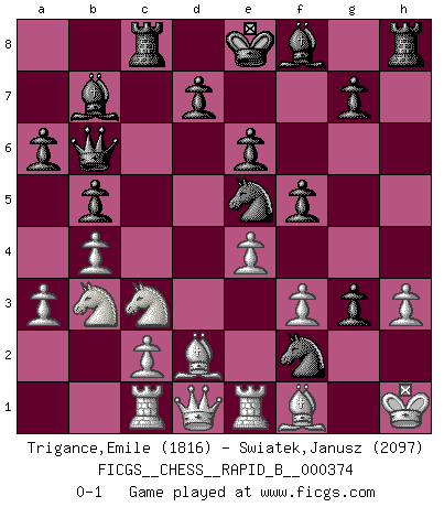 Last move : 0-1 2022 March 3 17:8:30 [Event "FICGS__CHESS__RAPID_B__000374"] [Site "FICGS"] [Date "2022.02.07"] [Round "1"] [White "Trigance,Emile"] [Black "Swiatek,Janusz"] [Result "0-1"] [WhiteElo "1816"] [BlackElo "2097"] 1.e4 c5 2.Nc3 a6 3.Nf3 b5 4.d4 cxd4 5.Nxd4 e6 6.a3 Bb7 7.b4 Nf6 8.Bd3 Nc6 9.Nb3 Rc8 10.Bd2 Ne5 11.O-O Qc7 12.Rc1 Nfg4 13.g3 h5 14.h3 f5 15.Re1 h4 16.Bf1 hxg3 17.f3 Qb6+ 18.Kh1 Nf2+ 0-1 Sicilian : Closed Kingside Castling by player White (move 11) Player Black won this chess game. Follow this game move after move (download)A Chess game is a dialogue, a conversation between a player and his opponent. Each move by the opponent may contain threats or be a blunder, but a player cannot defend against threats or take advantage of blunders if he does not first ask himself: What is my opponent planning after each move ? (Bruce A. Moon) Meine Liebe ist Schach, Schach, Schach. Ich muss jeden Tag Schach spielen, deshalb fühle ich mich so stark. (Miguel Najdorf) Yo creo que el Ajedrez posee una magia que es también una ayuda en la edad avanzada. Una rodilla reumática es olvidada durante una partida de Ajedrez y otros eventos pueden parecer algo sin importancia comparada a una catástrofe en el tablero de Ajedrez. (Vlastimil Hort) On n'a jamais que l'âge auquel on a commence à jouer aux échecs car après on cesse de vieillir. (Capablanca) Nowadays, anyone who cannot speak English and is incapable of using the Internet is regarded as backward. (Al-Waleed bin Talal)