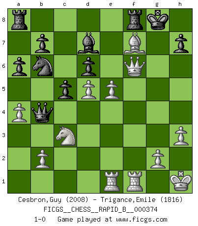 Last move : 1-0 2022 April 5 8:39:31 [Event "FICGS__CHESS__RAPID_B__000374"] [Site "FICGS"] [Date "2022.02.07"] [Round "1"] [White "Cesbron,Guy"] [Black "Trigance,Emile"] [Result "1-0"] [WhiteElo "2008"] [BlackElo "1816"] 1.d4 Nf6 2.c4 c5 3.d5 e6 4.Nc3 exd5 5.cxd5 d6 6.Nf3 g6 7.e4 Bg7 8.h3 O-O 9.Bd3 a6 10.a4 Re8 11.O-O Nfd7 12.Bf4 Qe7 13.Kh1 Ne5 14.Nxe5 Bxe5 15.Bxe5 Qxe5 16.f4 Qd4 17.Qf3 Nd7 18.Rae1 Nb6 19.e5 Qb4 20.f5 Bd7 21.fxg6 fxg6 22.Qf7+ Kh8 23.Qf6+ Kg8 24.Bxg6 Rf8 25.Bf7+ 1-0 Benoni defense Kingside Castling by player Black (move 8) Kingside Castling by player White (move 11) Player White won this chess game. Follow this game move after move (download)Pawn endings are to Chess what putting is to golf. (Cecil Purdy) Ohne Fehler kann es keine Brillanz geben. (Emanuel Lasker) Uno por uno, yo los acribillé, mi superioridad muy pronto se volvio aparente. (Jose Capablanca) Mais l'homme est une créature légère et illogique : semblable au joueur d'échecs, il n'aime que le processus du but à atteindre, non le but lui-même. (Dostoïevsky) Man is reluctant to give credit for intelligence to anyone, except his enemies. (Albert Einstein)
