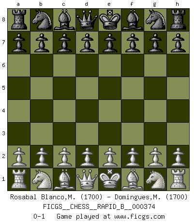 Last move : 0-1 2022 March 9 14:31:32 [Event "FICGS__CHESS__RAPID_B__000374"] [Site "FICGS"] [Date "2022.02.07"] [Round "1"] [White "Rosabal Blanco,Marcos Antonio"] [Black "Domingues,Miguel"] [Result "0-1"] [WhiteElo "1700"] [BlackElo "1700"] 0-1 This chess game has been lost on time (started : 2022.02.07 1:26:35) Player Black won this chess game. Follow this game move after move (download)There are two types of sacrifices: correct ones and mine. (Mikhail Tal) Schach verlangt totale Konzentration. (Robert James Fischer) Siempre es mejor sacrificar los hombres de tu oponente. (Savielly Tartakower) Je menace de comprendre la position. (Anonyme) The quality of decision is like the well-timed swoop of a falcon which enables it to strike and destroy its victim. (Sun Tzu)