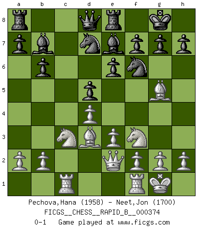 Last move : 0-1 2022 April 15 17:43:26 [Event "FICGS__CHESS__RAPID_B__000374"] [Site "FICGS"] [Date "2022.02.07"] [Round "1"] [White "Pechova,Hana"] [Black "Neet,Jon"] [Result "0-1"] [WhiteElo "1958"] [BlackElo "1700"] 1.d4 Nf6 2.c4 e6 3.Nc3 d5 4.Bg5 Be7 5.e3 c6 6.Nf3 Nbd7 7.Bd3 O-O 8.Rc1 b6 9.cxd5 cxd5 10.O-O Bb7 11.Qe2 Re8 0-1 This chess game has been lost on time (started : 2022.02.07 1:26:35) Queen's pawn game Kingside Castling by player Black (move 7) Kingside Castling by player White (move 10) Player Black won this chess game. Follow this game move after move (download)If a ruler does not understand Chess, how can he rule over a kingdom ? (King Khusros II) Wir können eben der zündenden Macht des Opfers nicht wiederstehen, denn die Begeisterung für das Opfer liegt in der Natur des Menschen. (Rudolf Spielmann) Evita las multitudes. Haz independientemente tu propio razonamiento. Trata de ser el jugador de Ajedrez, no la pieza de Ajedrez. (Ralph Charell) Il n'y a pas eu de défaite parce que je ne crois pas que cet ordinateur ait jamais existé. IBM a triché en refusant d'imprimer les modes de recherche de la machine. C'est évident, pendant le match, des coups décisifs ont été joués par des êtres humains. Aujourd'hui, les meilleurs spécialistes en informatique ne peuvent toujours pas expliquer comment Deep-Blue a pu jouer contre la logique des ordinateurs. IBM a gagné une guerre de communication, mais ils sont incapables de prouver que l'ordinateur a gagné tout seul. (Garry Kasparov) At work, the authority of a person is inversely proportional to the number of pens that person is carrying. (Dan Rotaru)