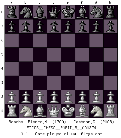 Last move : 0-1 2022 March 9 14:31:32 [Event "FICGS__CHESS__RAPID_B__000374"] [Site "FICGS"] [Date "2022.02.07"] [Round "1"] [White "Rosabal Blanco,Marcos Antonio"] [Black "Cesbron,Guy"] [Result "0-1"] [WhiteElo "1700"] [BlackElo "2008"] 0-1 This chess game has been lost on time (started : 2022.02.07 1:26:35) Player Black won this chess game. Follow this game move after move (download)Bobby Fischer is the greatest Chess player who has ever lived. (Ken Smith) Der Partner hat auch seine Existenzberechtigung. (Savielly Grigorievitsch Tartakower) El Ajedrez es un mar en el cual un mosquito puede beber y un elefante puede bañarse. (Refrán Hindú) Ne tendez aucun piège pour le plaisir ! Ne jouez rien dans l'espoir que l'adversaire réagisse de façon stupide ! Prenez toujours pour acquis que l'adversaire va trouver le meilleur coup ! Ne jouez jamais de coup dans l'espoir que l'adversaire ne voie pas la menace ! Chacun de vos coups doit améliorer la position d'une façon ou d'une autre. Whenever people agree with me, I always feel I must be wrong. (Oscar Wilde)