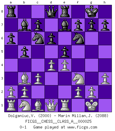 Last move : 0-1 2007 November 22 19:33:14 [Event "FICGS__CHESS__CLASS_A__000025"] [Site "FICGS"] [Date "2007.07.29"] [Round "1"] [White "Dolganiuc,Victor"] [Black "Marin Millan,Jose Antonio"] [Result "0-1"] [WhiteElo "2000"] [BlackElo "2088"] 1.e4 e5 2.Nf3 Nc6 3.Bb5 a6 4.Ba4 Nf6 5.O-O Be7 6.Re1 b5 7.Bb3 d6 8.c3 O-O 9.h3 Bb7 10.d4 Re8 0-1 Ruy Lopez : Closed Kingside Castling by player White (move 5) Kingside Castling by player Black (move 8) Player Black won this chess game. Follow this game move after move (download)Chess is everything: art, science and sport. (Anatoly Karpov) Ich war schon mal beim Dopingtest. Da musste ich Urin abgeben, während Dritte zusahen. (Elisabeth Pähtz) Fischer sacrificó virtualmente todo lo que la mayoría de nosotros los 'debiles' (término que él usa) valoramos, respetamos y apreciamos por el amor de un astuto, a menudo hermoso tablero de juego, por el privilegio ambivalente de ser su mas grande maestro. (Paul Kollar) Nous sommes les pions de la mystérieuse partie d'Echecs jouée par Dieu. Il nous déplace, nous arrête, nous pousse encore, puis nous lance un à un dans la boîte du Néant. Epitaphe sur la tombe de David Janowsky (1868-1927). Optimism is a variety of information deficit. Sometimes especially true for correspondence chess games. (Michael Aigner)