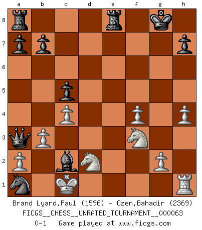 Last move : 0-1 2022 February 12 19:27:33 [Event "FICGS__CHESS__UNRATED_TOURNAMENT__000063"] [Site "FICGS"] [Date "2022.02.07"] [Round "1"] [White "Brand Lyard,Paul"] [Black "Ozen,Bahadir"] [Result "0-1"] [WhiteElo "1596"] [BlackElo "2369"] 1.e4 c5 2.Bc4 e6 3.d3 Nc6 4.Bb5 Qa5+ 5.Bd2 Qxb5 6.b3 Nf6 7.c4 Qb6 8.h4 d5 9.Bg5 dxe4 10.Bxf6 gxf6 11.dxe4 f5 12.exf5 Bg7 13.Nd2 Bxa1 14.Qxa1 Nd4 15.fxe6 Nc2+ 16.Ke2 Nxa1 17.exf7+ Kxf7 18.Ngf3 Re8+ 19.Kd1 Bf5 20.Ng5+ Kg8 21.f4 Qb4 22.Ngf3 Bc2+ 23.Kc1 Qa3+ 0-1 Sicilian defense Player Black won this chess game. Follow this game move after move (download)A good player is always lucky. (Jose Raul Capablanca) Drei Punkte vor allen anderen ist wie einer, der im weißen Anzug posiert, während der Rest in Müllsäcke gekleidet dasteht. (Viktor Kortschnoi) En el Ajedrez, tal como es jugado por los Maestros, practicamente la suerte es eliminada. (Emanuel Lasker) À la honte des hommes, on sait que les lois du jeu sont les seules qui soient partout justes, claires, inviolables et exécutées. Pourquoi l'Indien qui a donné les règles du jeu d'échecs est-il obéi de bon gré dans toute la terre, et que les décrétales des papes, par exemple, sont aujourd'hui un objet d'horreur et de mépris ? C'est que l'inventeur des échecs combina tout avec justesse pour la satisfaction des joueurs, et que les papes, dans leurs décrétales, n'eurent en vue que leur seul avantage. L'Indien voulut exercer également l'esprit des hommes et leur donner du plaisir; les papes ont voulu abrutir l'esprit des hommes. Voltaire (Dictionnaire philosophique / Garnier 1967) He who fights with monsters should be careful lest he thereby become a monster. (Friedrich Nietzsche, Beyond Good and Evil)