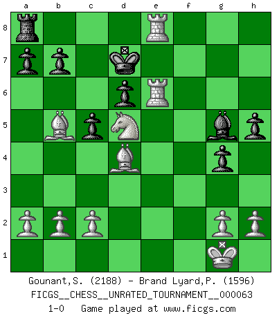 Last move : 1-0 2022 February 16 0:49:9 [Event "FICGS__CHESS__UNRATED_TOURNAMENT__000063"] [Site "FICGS"] [Date "2022.02.07"] [Round "1"] [White "Gounant,Stanislas"] [Black "Brand Lyard,Paul"] [Result "1-0"] [WhiteElo "2188"] [BlackElo "1596"] 1.e4 e5 2.f4 d6 3.d3 exf4 4.Bxf4 g5 5.Be3 f5 6.Qh5+ Kd7 7.Bd4 fxe4 8.Bxh8 exd3 9.Bxd3 Qe8+ 10.Qxe8+ Kxe8 11.Nf3 g4 12.Nd4 Ne7 13.O-O h5 14.Nc3 Nbc6 15.Rae1 Nxd4 16.Bxd4 Bh6 17.Nd5 c5 18.Rxe7+ Kd8 19.Rf6 Be6 20.Rfxe6 Bg5 21.Re8+ Kd7 22.Bb5+ 1-0 King's gambit Kingside Castling by player White (move 13) Player White won this chess game. Follow this game move after move (download)I'd rather have a Pawn than a finger. (Reuben Fine) Ein Gewinn durch eine ungenaue Kombination, sei sie auch noch so vorzeigbar, erfüllt mich mit Schaudern. (Wilhelm Steinitz) Yo considero que Fischer es uno de los expertos mas grandes de aperturas de siempre. (Keith Hayward) Le jeu d'échecs fait naître et fortifie en nous plusieurs qualités précieuses dans le cours de l'existence, telles que la prévoyance, la circonspection, la prudence, et la persévérance. (Benjamin Franklin - 1783, la morale des échecs) Thus, what is of supreme importance in war is to attack the enemy's strategy. (Sun Tzu)