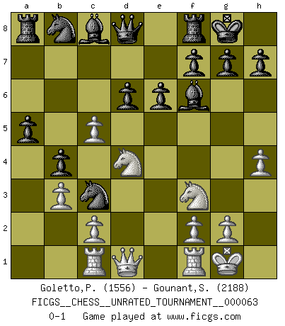 Last move : 0-1 2022 May 2 8:38:36 [Event "FICGS__CHESS__UNRATED_TOURNAMENT__000063"] [Site "FICGS"] [Date "2022.02.07"] [Round "1"] [White "Goletto,Piero Giuseppe"] [Black "Gounant,Stanislas"] [Result "0-1"] [WhiteElo "1556"] [BlackElo "2188"] 1.e4 b6 2.Nc3 c5 3.Nf3 e6 4.Bb5 a6 5.O-O axb5 6.a4 b4 7.Ne2 Nf6 8.b3 d6 9.a5 Be7 10.d4 O-O 11.Bg5 bxa5 12.dxc5 Nxe4 13.Ned4 Bxg5 14.h4 Bf6 15.Rc1 Nc3 0-1 This chess game has been lost on time (started : 2022.02.07 8:45:27) Owen defense Kingside Castling by player White (move 5) Kingside Castling by player Black (move 10) Player Black won this chess game. Follow this game move after move (download)Not all artists are Chess players, but all Chess players are artists. (Marcel Duchamp) Alles was ich jemals tun will ist Schach spielen. (Robert James Fischer) Por esta medida (el intervalo entre Fischer y sus contemporaneos), yo le considero el mas grande campeón mundial. (Garry Kasparov) L'action d'une oeuvre littéraire se déroule sur un champ de bataille. Les masques et les types du drame moderne correspondent aux pièces du jeu d'échecs. L'intrigue correspond aux coups et aux gambits, c'est à dire aux techniques du jeu telles qu'utilisées et interprétées par les joueurs. Les tactiques et les péripéties [mouvements] correspondent aux coups exécutés par l'adversaire. (Viktor Shklovsky) When you stop learning you start dying. (M. Scott Adams)