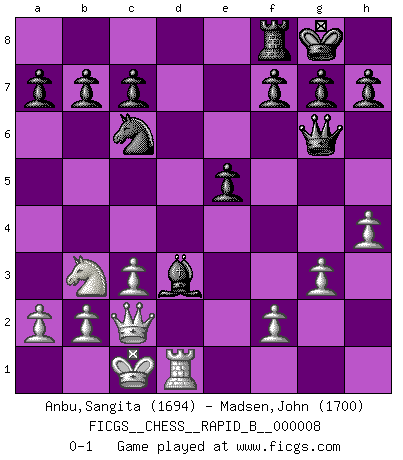 Last move : 0-1 2006 September 15 7:6:27 [Event "FICGS__CHESS__RAPID_B__000008"] [Site "FICGS"] [Date "2006.06.24"] [Round "1"] [White "Anbu,Sangita"] [Black "Madsen,John"] [Result "0-1"] [WhiteElo "1694"] [BlackElo "1700"] 1.d3 d5 2.c3 e5 3.Qc2 Nc6 4.e4 Nf6 5.Bg5 Be7 6.Nd2 O-O 7.exd5 Nxd5 8.Bxe7 Qxe7 9.O-O-O Bf5 10.Ngf3 Rad8 11.h4 Qc5 12.Nb3 Qd6 13.Ng5 Nf4 14.Ne4 Qg6 15.g3 Nxd3+ 16.Bxd3 Rxd3 17.Rxd3 Bxe4 18.Rhd1 Bxd3 0-1 This chess game has been lost on time (started : 2006.06.24 18:33:5) Mieses Opening Kingside Castling by player Black (move 6) Queenside Castling by player White (move 9) Player Black won this chess game. Follow this game move after move (download)Chess teaches you to control the initial excitement you feel when you see something that looks good and it trains you to think objectively when you're in trouble. (Stanley Kubrick) Um sich vor der Gefahr einer Erkältung zu schützen, sorge der wanderlustige König beizeiten für ein brauchbares Versteck. (Aaron Nimzowitsch) El ganador de una partida es aquel jugador que hace el penúltimo error. (Savielly Tartakover) La menace est plus forte que l'exécution. (Aaron Nimzovitch) Those parts of the system that you can hit with a hammer (not advised) are called hardware; those program instructions that you can only curse at are called software. (Anonymous)
