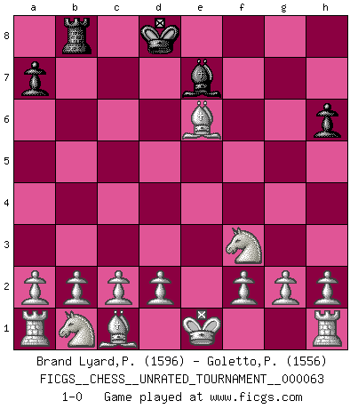 Last move : 1-0 2022 May 27 2:10:56 [Event "FICGS__CHESS__UNRATED_TOURNAMENT__000063"] [Site "FICGS"] [Date "2022.02.07"] [Round "1"] [White "Brand Lyard,Paul"] [Black "Goletto,Piero Giuseppe"] [Result "1-0"] [WhiteElo "1596"] [BlackElo "1556"] 1.e4 e5 2.Bc4 Nc6 3.Bb5 Nce7 4.Qh5 g6 5.Qg5 c6 6.Bc4 h6 7.Qxe5 d6 8.Qxh8 Kd7 9.Bxf7 Nf6 10.Qxf6 Ng8 11.Qxg6 Ne7 12.Qe6+ Kc7 13.Qf6 Ng8 14.Qxd8+ Kxd8 15.Bxg8 d5 16.exd5 cxd5 17.Bxd5 Bd7 18.Bxb7 Rb8 19.Bd5 Be6 20.Bxe6 Be7 21.Nf3 1-0 Bishop's Opening Player White won this chess game. Follow this game move after move (download)In a gambit you give up a Pawn for the sake of getting a lost game. (Samuel Standige Boden) Wenn du auf das Glück wartest, wird das Leben ziemlich langweilig. (Mikhail Nekhemyevich Tal) Juega la Apertura como un libro, el Juego Medio como un mago y los Finales como una máquina. (Spielmann) Les écrivains ont utilisé les échecs pour analyser les côtés extrêmes de la nature humaine. Dans ce cadre, les échecs offrent un champ d'expérimentation idéal. Mais on pourrait faire la même chose avec la peinture. Et là, en vous référant à Van Gogh, vous ne tirerez pas de conclusion définitive sur les peintres. (Gary Kasparov) I couldn't make any sense out of what this particular thread is about. It sounds like R2 D2 computer speaking. A space fight ?!? Some 'command' problems in Moscow ? Some killers & narcotic addicts attacking some game & a god wannabe ?? (Dinesh De Silva, lost in a russian conflict in FICGS forum)