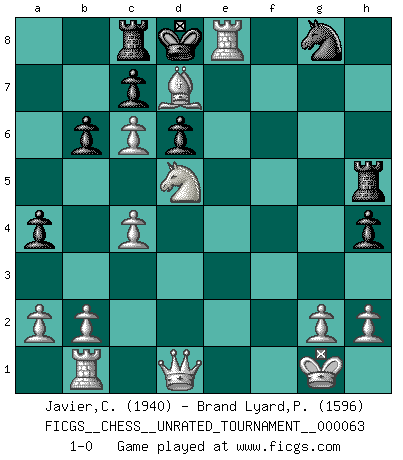 Last move : 1-0 2022 February 28 12:49:17 [Event "FICGS__CHESS__UNRATED_TOURNAMENT__000063"] [Site "FICGS"] [Date "2022.02.07"] [Round "1"] [White "Javier,Christian"] [Black "Brand Lyard,Paul"] [Result "1-0"] [WhiteElo "1940"] [BlackElo "1596"] 1.e4 e5 2.Nf3 Nc6 3.Bb5 Qf6 4.c3 d6 5.d4 g6 6.d5 Bg4 7.dxc6 b6 8.Be2 Bxf3 9.Bxf3 h5 10.c4 a5 11.Nc3 a4 12.Rb1 Qe6 13.Nd5 Rc8 14.O-O h4 15.Bg4 f5 16.Bh3 Bh6 17.f4 exf4 18.exf5 Qf7 19.fxg6 Qxg6 20.Bxf4 Bxf4 21.Rxf4 Rh5 22.Bd7+ Kd8 23.Rf8+ Qe8 24.Rxe8+ 1-0 Ruy Lopez (Spanish Opening) Kingside Castling by player White (move 14) Player White won this chess game. Follow this game move after move (download)Chess is imagination. (David Bronstein) Am wohlsten fühle ich mich, wenn ich sehe, wie sich mein Gegner im Todeskampf windet. (Robert James Fischer) El muchacho (en ese entonces un niño de 12 años llamado Anatoly Karpov) no tiene ni idea de lo que es el Ajedrez y no hay futuro en absoluto para el en esta profesión. (Mikhail Botvinnik) Assurément je connaissais par expérience le mystérieux attrait de ce jeu royal, le seul entre tous les jeux inventés par les hommes qui échappe souverainement à la tyrannie du hasard, le seul où l'on ne doive sa victoire qu'à son intelligence ou plutôt à une certaine forme d'intelligence. Mais n'est-ce pas déjà le limiter injurieusement que d'appeler les échecs un jeu ? N'est-ce pas une science, un art ou quelque chose qui, comme le cercueil de Mahomet entre ciel et terre, est suspendu entre l'un et l'autre, et qui réunit un nombre incroyable de contraires ? [...] C'est une pensée qui ne mène à rien, une mathématique qui n'établit rien, un art qui ne laisse pas d'uvre, une architecture sans matière; et il l'a prouvé néanmoins qu'il était plus durable, à sa manière, que les livres ou que tout autre monument, ce jeu unique qui appartient à tous les peuples et à tous les temps, et dont personne ne sait quel dieu en fit don à la terre pour tuer l'ennui, pour aiguiser l'esprit et stimuler l'âme. Où commence-t-il, où finit-il ? (Stefan Zweig) You lose, general Kenobi. (General Grievous in Star Wars ep.3)