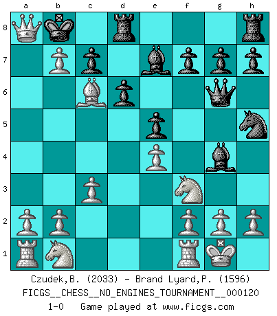 Last move : 1-0 2022 February 20 5:9:54 [Event "FICGS__CHESS__NO_ENGINES_TOURNAMENT__000120"] [Site "FICGS"] [Date "2022.02.07"] [Round "1"] [White "Czudek,Bohuslav"] [Black "Brand Lyard,Paul"] [Result "1-0"] [WhiteElo "2033"] [BlackElo "1596"] 1.e4 e5 2.Nf3 Nc6 3.Bb5 Qf6 4.c3 Be7 5.O-O d6 6.d4 Qg6 7.d5 Bg4 8.dxc6 O-O-O 9.cxb7+ Kb8 10.Bc6 Nf6 11.Be3 Nh5 12.Bxa7+ Kxa7 13.Qa4+ Kb6 14.Qb5+ Ka7 15.Qa5+ Kb8 16.Qa8+ 1-0 Ruy Lopez (Spanish Opening) Kingside Castling by player White (move 5) Queenside Castling by player Black (move 8) Player White won this chess game. Follow this game move after move (download)The way he plays Chess demonstrates a man's whole nature. (Stanley Ellin) Konzentriere dich auf materielle Gewinne. Nimm, was dir dein Gegner gibt, ausser es gibt einen guten Grund der dagegenspricht. (Robert James Fischer) Morphy probablemente fue el genio más grande de todos. (Bobby Fischer) Votre prénom est 'Tactique', votre deuxième prénom est 'Tactique' et votre nom est 'Tactique'. (Ken Smith) Information on the Internet is subject to the same rules and regulations as conversation at a bar. (George Lundberg)