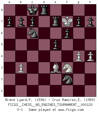 Last move : 0-1 2022 March 4 22:27:39 [Event "FICGS__CHESS__NO_ENGINES_TOURNAMENT__000120"] [Site "FICGS"] [Date "2022.02.07"] [Round "1"] [White "Brand Lyard,Paul"] [Black "Cruz Ramirez,Eliecer"] [Result "0-1"] [WhiteElo "1596"] [BlackElo "1983"] 1.a4 e5 2.e4 Nf6 3.Nc3 Bb4 4.Nd5 Nxd5 5.c3 Nf6 6.cxb4 d5 7.d3 Qd6 8.exd5 Qxb4+ 9.Qd2 Nxd5 10.Qxb4 Nxb4 11.Ke2 N8c6 12.Nf3 Bf5 13.h4 Bxd3+ 14.Ke3 Bxf1 15.Rxf1 Nc2+ 16.Ke4 Nxa1 17.Bg5 Nb3 18.Rd1 Nc5+ 19.Kd5 Nxa4 20.b3 Nc3+ 21.Kc5 Nxd1 22.Kd5 Nxf2 23.g4 f6 24.Be3 O-O-O 25.Ke6 Rhe8+ 26.Kf7 Re7+ 0-1 Ware (Meadow Hay) Opening Queenside Castling by player Black (move 24) Player Black won this chess game. Follow this game move after move (download)Chess holds its master in its own bonds, shackling the mind and brain so that the inner freedom of the very strongest must suffer. (Albert Einstein) Wie kann ich Remis annehmen? Ich weiß ja gar nicht, wie ich stehe! (Fritz Sämisch) Cuando veas una buena jugada, trata de encontrar otra mejor. (Emanuel Lasker) Le joueur d'Echecs qui veut atteindre le top est obligé de développer son propre credo créatif. Alexeï Stepanovicth Souétine. Il est facile d'écrire des livres ! Ce qui est difficile, c'est de jouer ! (Alexeï Stepanovicth Souétine) Experiences are the keys to life. (Daniel Parmet)