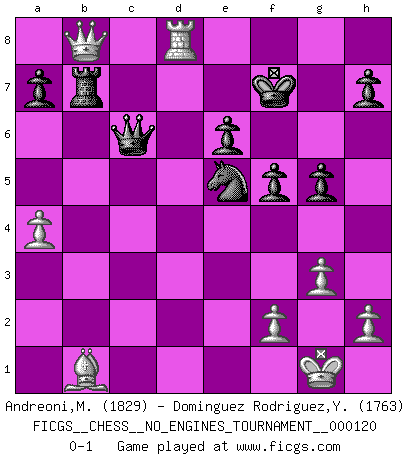 Last move : 0-1 2022 March 14 21:21:40 [Event "FICGS__CHESS__NO_ENGINES_TOURNAMENT__000120"] [Site "FICGS"] [Date "2022.02.07"] [Round "1"] [White "Andreoni,Mario"] [Black "Dominguez Rodriguez,Yosvany"] [Result "0-1"] [WhiteElo "1829"] [BlackElo "1763"] 1.d4 Nf6 2.c4 g6 3.Nc3 d5 4.cxd5 Nxd5 5.e4 Nxc3 6.bxc3 Bg7 7.Bc4 c5 8.Ne2 Nc6 9.Be3 O-O 10.O-O b6 11.a4 Bb7 12.dxc5 bxc5 13.Bxc5 Qc7 14.Bd5 Rfd8 15.Qc2 e6 16.Ba2 Ba6 17.Rfd1 Ne5 18.Bd4 Ng4 19.e5 Bxe5 20.Bxe5 Nxe5 21.Nd4 Ng4 22.g3 Rxd4 23.Rxd4 Ne5 24.Rf4 Rc8 25.Rd1 Bb7 26.Qe2 g5 27.Re4 Bxe4 28.Qxe4 Qxc3 29.Bb1 f5 30.Qb7 Rc7 31.Qb8+ Kf7 32.Rd8 Qc1+ 33.Kg2 Qc6+ 34.Kg1 Rb7 0-1 King's Indian defense, 3.Nc3 Kingside Castling by player Black (move 9) Kingside Castling by player White (move 10) Player Black won this chess game. Follow this game move after move (download)Via the squares on the chessboard, the Indians explain the movement of time and the age, the higher influences which control the world and the ties which link Chess with the human soul. (Al-Masudi) Ein Teil des Fehlers ist immer korrekt. (Savielly Grigorievitsch Tartakower) El Ajedrez te enseña a controlarl la excitación inicial que sientes cuando vez algo que parece bueno y te enseña a pensar objetivamente cuando te encuentras en problemas. (Stanley Kubrick) Donnez-moi un Cavalier en 6e et je gagnerais toutes mes parties. (Steinitz) No enterprise is more likely to succeed than one concealed from the enemy until it is ripe for execution. (Niccolo Machiavelli)