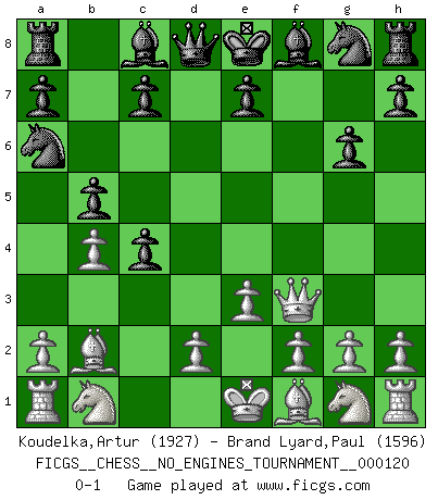 Last move : 0-1 2022 April 1 22:54:34 [Event "FICGS__CHESS__NO_ENGINES_TOURNAMENT__000120"] [Site "FICGS"] [Date "2022.02.07"] [Round "1"] [White "Koudelka,Artur"] [Black "Brand Lyard,Paul"] [Result "0-1"] [WhiteElo "1927"] [BlackElo "1596"] 1.b4 f5 2.Bb2 d5 3.c4 dxc4 4.e3 b5 5.Qh5+ Kd7 6.Qxf5+ Ke8 7.Qh5+ g6 8.Qf3 Na6 0-1 This chess game has been lost on time (started : 2022.02.07 20:51:56) Polish (Sokolsky) opening Player Black won this chess game. Follow this game move after move (download)In order to improve your game, you must study the endgame before everything else, for whereas the endings can be studied and mastered by themselves, the middle game and the opening must be studied in relation to the endgame. (Jose Raul Capablanca) Lisa Lane, amerikanische Schachmeisterin, hatte Fischer einmal als stärksten lebenden Spieler bezeichnet. Antwort: Das ist richtig, aber Lisa Lane ist eigentlich nicht in der Lage, das zu beurteilen. (Robert James Fischer) De todos mis libros Rusos, la defensa contiene y difunde el 'calor' mas grande que pudiese verse extraño al observar lo supremamente abstracto que el Ajedrez supuestamente es. (Vladimir Nabokov) Un footballeur joue avec ses pieds, parfois avec sa tête. Un joueur d'échecs ne joue qu'avec sa tête. Et quand il ne joue plus, il meurt. (Jacob Murray) Strategy without tactics is the slowest route to victory. Tactics without strategy is the noise before defeat. (Sun Tzu)