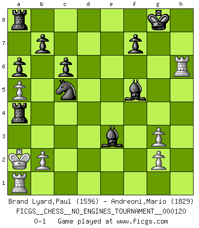 Last move : 0-1 2022 February 28 13:10:19 [Event "FICGS__CHESS__NO_ENGINES_TOURNAMENT__000120"] [Site "FICGS"] [Date "2022.02.07"] [Round "1"] [White "Brand Lyard,Paul"] [Black "Andreoni,Mario"] [Result "0-1"] [WhiteElo "1596"] [BlackElo "1829"] 1.a4 e5 2.h4 d5 3.a5 Bc5 4.h5 h6 5.e3 Nf6 6.Bb5+ c6 7.Bd3 a6 8.c4 e4 9.Bc2 d4 10.exd4 Qxd4 11.Qe2 O-O 12.d3 Bg4 13.Qe3 Qd6 14.Qg3 Qxg3 15.fxg3 exd3 16.Bxd3 Nxh5 17.Rh4 Re8+ 18.Kd2 Nf6 19.Kc3 Bxg1 20.Nd2 Nbd7 21.Ne4 Nxe4+ 22.Bxe4 Rxe4 23.Bxh6 Bd4+ 24.Kd3 Nc5+ 25.Kd2 gxh6 26.Rxh6 Be3+ 27.Kc2 Rxc4+ 28.Kb1 Bf5+ 29.Ka2 Ra4+ 0-1 Crab Opening Kingside Castling by player Black (move 11) Player Black won this chess game. Follow this game move after move (download)Any material change in a position must come about by mate, a capture, or a Pawn promotion. (Purdy) Es hat in meinem Leben Zeiten gegeben, da ich sehr nahe daran war zu glauben, daß ich auch nicht eine einzige Schachpartie verlieren könnte. (José Raúl Capablanca) Morphy probablemente fue el genio más grande de todos. (Bobby Fischer) Ce qui est bien, c'est d'avoir tout un tas de pièces en prise : l'adversaire ne peut en prendre qu'une à la fois. Cité par Thierry Audin. Creativity involves breaking out of established patterns in order to look at things in a different way. (Edward De Bono)