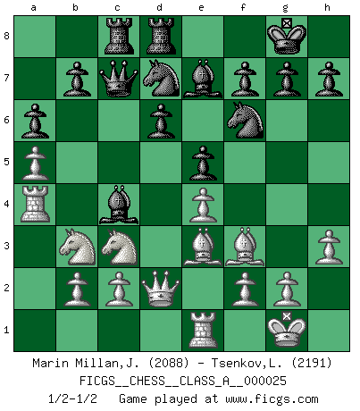 Last move : 1/2-1/2 2007 September 15 14:27:24 [Event "FICGS__CHESS__CLASS_A__000025"] [Site "FICGS"] [Date "2007.07.29"] [Round "1"] [White "Marin Millan,Jose Antonio"] [Black "Tsenkov,Ljubomir"] [Result "1/2-1/2"] [WhiteElo "2088"] [BlackElo "2191"] 1.e4 c5 2.Nf3 d6 3.d4 cxd4 4.Nxd4 Nf6 5.Nc3 a6 6.Be2 e5 7.Nb3 Be7 8.O-O O-O 9.Be3 Be6 10.Qd2 Nbd7 11.a4 Qc7 12.a5 Qc6 13.Bf3 Rac8 14.Rfc1 Bc4 15.Ra4 Rfe8 16.h3 Red8 17.Re1 Qc7 1/2-1/2 Sicilian : Najdorf, Opovcensky variation Kingside Castling by player White (move 8) Kingside Castling by player Black (move 8) This chess game ended in a draw. Follow this game move after move (download)All that matters on the Chessboard is good moves. (Bobby Fischer) Auf Remis zu spielen ist gewissermaßen ein Verbrechen gegen das Schachspiel. (Mikhail Nekhemyevich Tal) Tu puedes aprender mucho mas de una partida que pierdas que de una partida ganada. Tendras que perder cientos de partidas antes de llegar a ser un buen jugador. (Jose Raul Capablanca) Si le désir cupide (et stupide) de gagner est une inépuisable source de souffrance, une combinaison brillante sur l'échiquier est une découverte : le coquelicot qui s'épanouit lorsque apparaît la Voie Lactée. (Arrabal) The various flowers seem good to different people. (Chinese proverb)