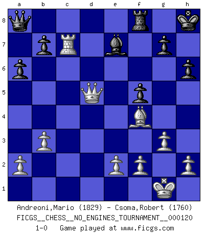 Last move : 1-0 2022 April 2 15:43:23 [Event "FICGS__CHESS__NO_ENGINES_TOURNAMENT__000120"] [Site "FICGS"] [Date "2022.02.07"] [Round "1"] [White "Andreoni,Mario"] [Black "Csoma,Robert"] [Result "1-0"] [WhiteElo "1829"] [BlackElo "1760"] 1.d4 f5 2.g3 Nf6 3.Bg2 e6 4.Nf3 Be7 5.O-O O-O 6.c4 d5 7.b3 c5 8.cxd5 exd5 9.dxc5 Bxc5 10.Nc3 Nc6 11.Bg5 Be6 12.Rc1 Be7 13.Nd4 Nxd4 14.Qxd4 h6 15.Bf4 a6 16.Rfd1 Rc8 17.Nxd5 Nxd5 18.Rxc8 Qxc8 19.Bxd5 Bxd5 20.Qxd5+ Kh8 21.Rc1 Qa8 22.Rc7 1-0 Dutch defense Kingside Castling by player White (move 5) Kingside Castling by player Black (move 5) Player White won this chess game. Follow this game move after move (download)There are tough players and nice guys, and I'm a tough player. (Bobby Fischer) Der beste Spieler in einem Turnier gewinnt es nie. Er landet auf Platz zwei oder drei. (Siegbert Tarrasch) Si yo gano un torneo, yo lo gano por mí mismo. Yo hago las jugadas. Nadie me ayuda. (Bobby Fischer) Les échecs, c'est l'imagination. (David Bronstein) The existence of forgetting has never been proved: We only know that some things don't come to mind when we want them. (Friedrich Nietzsche)