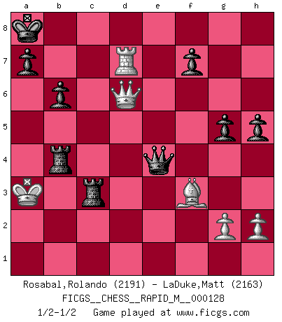 Last move : 1/2-1/2 2022 May 16 2:44:21 [Event "FICGS__CHESS__RAPID_M__000128"] [Site "FICGS"] [Date "2022.02.08"] [Round "1"] [White "Rosabal,Rolando"] [Black "LaDuke,Matt"] [Result "1/2-1/2"] [WhiteElo "2191"] [BlackElo "2163"] 1.c4 e5 2.Nc3 Nf6 3.Nf3 Nc6 4.e3 Bb4 5.Qc2 Bxc3 6.Qxc3 Qe7 7.d4 exd4 8.Nxd4 Nxd4 9.Qxd4 b6 10.b3 Bb7 11.Bb2 O-O-O 12.Qe5 Qb4+ 13.Bc3 Qa3 14.Bb2 Qf8 15.f3 d6 16.Qc3 Qe7 17.O-O-O Rhg8 18.Kb1 Kb8 19.b4 Nd7 20.Bd3 h5 21.e4 g5 22.Rhe1 Qe5 23.Qd2 Qe6 24.Qc2 Ne5 25.Be2 c5 26.a3 Rd7 27.Rd2 cxb4 28.axb4 Rc8 29.Rc1 Rdc7 30.Qd1 Nxc4 31.Rxc4 Rxc4 32.Rxd6 Bxe4+ 33.fxe4 Qxe4+ 34.Ka2 Rxb4 35.Bc3 Rxc3 36.Rd8+ Rc8 37.Qd6+ Kb7 38.Rd7+ Ka8 39.Bf3 Rc2+ 40.Ka3 Rc3+ 1/2-1/2 English Opening Queenside Castling by player Black (move 11) Queenside Castling by player White (move 17) This chess game ended in a draw. Follow this game move after move (download)You know you're going to lose. Even when I was ahead I knew I was going to lose. - On playing against Fischer. (Andrew Soltis) Ich bin der einzige Schachspieler, der sich während der Vorbereitungen zum Turnier verletzt hat. (Woody Allen) Cuando veas una buena jugada, trata de encontrar otra mejor. (Emanuel Lasker) Le succès, c'est être capable d'aller d'échec en échec sans perdre son enthousiasme. (Winston Churchill) Art is the only way to run away without leaving home. (Twyla Tharp)