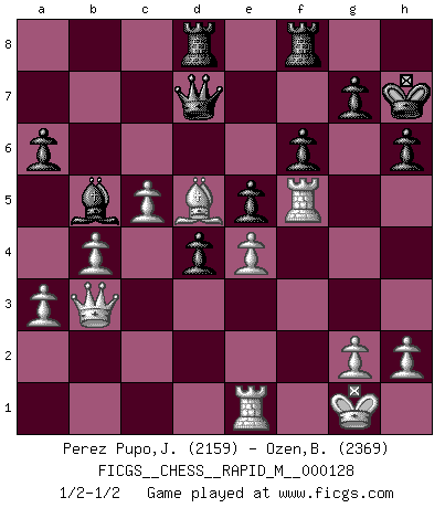 Last move : 1/2-1/2 2022 February 26 20:0:48 [Event "FICGS__CHESS__RAPID_M__000128"] [Site "FICGS"] [Date "2022.02.08"] [Round "1"] [White "Perez Pupo,Juan Rafael"] [Black "Ozen,Bahadir"] [Result "1/2-1/2"] [WhiteElo "2159"] [BlackElo "2369"] 1.c4 e5 2.Nc3 Nf6 3.Nf3 Nc6 4.e4 Bb4 5.d3 d6 6.a3 Bc5 7.b4 Bb6 8.Na4 Bd4 9.Rb1 a6 10.Be2 b5 11.Nxd4 Nxd4 12.Nc3 Bb7 13.f3 O-O 14.O-O Nh5 15.Be3 Nf4 16.Qd2 Nfe6 17.Bd1 c5 18.Bb3 Bc6 19.Ba2 Rc8 20.Ne2 Qd7 21.Rbe1 h6 22.Bxd4 Nxd4 23.Nxd4 cxd4 24.f4 bxc4 25.dxc4 Ba4 26.fxe5 dxe5 27.c5 Kh7 28.Bd5 Rcd8 29.Rf5 f6 30.Qd3 Bb5 31.Qb3 1/2-1/2 English Opening Kingside Castling by player Black (move 13) Kingside Castling by player White (move 14) This chess game ended in a draw. Follow this game move after move (download)For me, Chess is life and every game is like a new life. Every Chess player gets to live many lives in one lifetime. (Eduard Gufeld) Wir können eben der zündenden Macht des Opfers nicht wiederstehen, denn die Begeisterung für das Opfer liegt in der Natur des Menschen. (Rudolf Spielmann) Cualquier cambio de material en una posición debe venir por medio de un mate, una captura o promoción de Peón. (Purdy) Des points faibles ou des trous dans la position de l'adversaire doivent être occupés par des pièces et non pas par des pions. (Siegbert Tarrasch) Chess is everything: art, science and sport. (Anatoly Karpov)