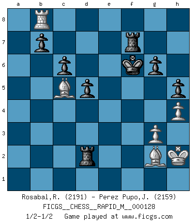 Last move : 1/2-1/2 2022 April 29 19:55:0 [Event "FICGS__CHESS__RAPID_M__000128"] [Site "FICGS"] [Date "2022.02.08"] [Round "1"] [White "Rosabal,Rolando"] [Black "Perez Pupo,Juan Rafael"] [Result "1/2-1/2"] [WhiteElo "2191"] [BlackElo "2159"] 1.Nf3 d5 2.c4 c6 3.g3 Nf6 4.Bg2 dxc4 5.O-O Nbd7 6.Na3 Nb6 7.Qc2 Be6 8.Ne5 h5 9.h4 Qd4 10.Nf3 Qe4 11.Qd1 Bg4 12.b3 cxb3 13.axb3 g6 14.Nc4 Nxc4 15.d3 Nb2 16.Bxb2 Qe6 17.Ng5 Qc8 18.f3 Bd7 19.d4 Bg7 20.e4 O-O 21.Kh2 Nh7 22.Qd2 Qc7 23.Nxh7 Kxh7 24.Rf2 a5 25.f4 Bg4 26.Bc3 Rfd8 27.Raf1 e6 28.f5 Rd7 29.Qg5 Bh6 30.Qf6 Rc8 31.Bd2 Bg7 32.Qg5 Qd8 33.fxg6+ fxg6 34.Rf6 Qe8 35.R1f2 Ra8 36.d5 a4 37.bxa4 Rxa4 38.Bc1 Rc4 39.Be3 Ra4 40.Bc5 exd5 41.e5 Ra8 42.e6 Bxe6 43.Re2 Bxf6 44.Qxf6 Rf7 45.Qxe6 Qxe6 46.Rxe6 Ra2 47.Kh3 Rd2 48.Rd6 Rd3 49.Rd8 Kg7 50.Rb8 Kf6 51.Kh2 Rd2 52.Kg1 Rd1+ 53.Kh2 Rd2 54.Kg1 Rd1+ 55.Kh2 Rd2 1/2-1/2 Reti Opening Kingside Castling by player White (move 5) Kingside Castling by player Black (move 20) This chess game ended in a draw. Follow this game move after move (download)Chess is above all, a fight ! (Emanuel Lasker) Man gibt nur Pakete auf. (Paul Keres) Antes de los Finales, los dioses han colocado el Juego Medio. (Siegbert Tarrasch) Donnez-moi un Cavalier en 6e et je gagnerais toutes mes parties. (Steinitz) It is not titles that honor men, but men that honor titles. (Niccolo Machiavelli)