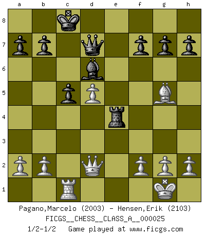 Last move : 1/2-1/2 2007 October 8 17:35:11 [Event "FICGS__CHESS__CLASS_A__000025"] [Site "FICGS"] [Date "2007.07.29"] [Round "1"] [White "Pagano,Marcelo"] [Black "Hensen,Erik"] [Result "1/2-1/2"] [WhiteElo "2003"] [BlackElo "2103"] 1.e4 c5 2.Nf3 d6 3.Bb5+ Bd7 4.Bxd7+ Qxd7 5.O-O Nc6 6.c3 Nf6 7.d4 Nxe4 8.d5 Ne5 9.Nxe5 dxe5 10.Re1 Nf6 11.Rxe5 e6 12.c4 O-O-O 13.Nc3 Bd6 14.Re1 exd5 15.cxd5 Rhe8 16.Bg5 Rxe1+ 17.Qxe1 Re8 18.Qd2 Ne4 19.Nxe4 Rxe4 20.Rc1 1/2-1/2 Sicilian : Canal-Sokolsky attack, Bronstein gambit Kingside Castling by player White (move 5) Queenside Castling by player Black (move 12) This chess game ended in a draw. Follow this game move after move (download)The game of chess is the touchstone of the intellect. (Goethe) Man kann eine Schachpartie nur gewinnen, wenn das Gleichgewicht gestört ist. In einer Stellung mit ungestörtem Gleichgewicht ist auch das größte Genie hilflos - in der Stellung steckt dann eben kein genialer Einfall. (Wilhelm Steinitz) A la fecha, Fischer esta simplemente un nivel arriba de todos los mejores jugadores de Ajedrez del mundo. (John Jacobs) Avec des compensations pour le matériel en plus... (Anonyme) No, I am still playing. (Anatoly Karpov)