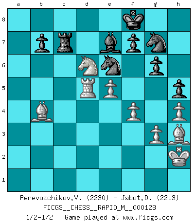 Last move : 1/2-1/2 2022 August 2 1:15:11 [Event "FICGS__CHESS__RAPID_M__000128"] [Site "FICGS"] [Date "2022.02.08"] [Round "1"] [White "Perevozchikov,Vjacheslav"] [Black "Jabot,Daniel"] [Result "1/2-1/2"] [WhiteElo "2230"] [BlackElo "2213"] 1.Nf3 Nf6 2.g3 g6 3.Bg2 Bg7 4.O-O O-O 5.d4 d5 6.c4 dxc4 7.Na3 c3 8.bxc3 c5 9.Re1 Nc6 10.Bb2 Qb6 11.Nc4 Qb5 12.Qb3 Qxb3 13.axb3 Be6 14.e4 cxd4 15.cxd4 Nb4 16.Rad1 Rac8 17.d5 Bg4 18.h3 Bxf3 19.Bxf3 Nd7 20.e5 Nc5 21.d6 exd6 22.Nxd6 Rc7 23.Re3 Rd8 24.Be2 a6 25.h4 Rcd7 26.Bg4 Ne6 27.Bc3 Nc6 28.f4 h5 29.Bh3 Bf8 30.Red3 a5 31.Be1 Ra8 32.Bf2 a4 33.bxa4 Rxa4 34.Rb1 Be7 35.R3d1 Ncd8 36.Rb2 Ra3 37.Kh2 Kf8 38.Bg2 Rc3 39.R1d2 Ra3 40.Rb6 Ra6 41.Bf1 Rxb6 42.Bxb6 Nc7 43.Be3 Nce6 44.Bb6 Nc7 45.Bh3 Nde6 46.Ba5 Ne8 47.Bb4 N8g7 48.Rd5 Rc7 1/2-1/2 Reti : King's Indian attack Kingside Castling by player White (move 4) Kingside Castling by player Black (move 4) This chess game ended in a draw. Follow this game move after move (download)One of these modest little moves may be more embarrassing to your opponent than the biggest threat. (Siegbert Tarrasch) Ein guter Spieler hat immer Glück. (José Raúl Capablanca) Tu sabes, camarada Pachman, no disfruto el ser un Ministro, preferería jugar al Ajedrez como tu. (Che Guevara) En blitz, le Cavalier l'emporte sur le Fou. (Vlastimil Hort) . 'gn is not allowed in chess unless n is an integer between 1 and 8 inclusive, where 1 and 8 are to interpreted as the standard numerals standing for integers in the ordered real-closed field R, with the *canonical* ordering. (As opposed to, say, an integer in the domain Z[2+i*sqrt(5)] or an integer in some exotic Grothendieck topos). (Normajean Yates)