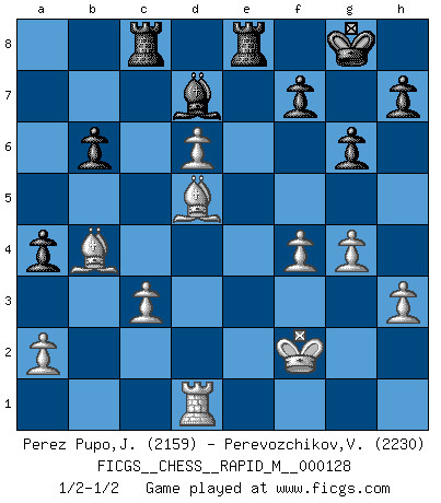 Last move : 1/2-1/2 2022 May 4 18:23:46 [Event "FICGS__CHESS__RAPID_M__000128"] [Site "FICGS"] [Date "2022.02.08"] [Round "1"] [White "Perez Pupo,Juan Rafael"] [Black "Perevozchikov,Vjacheslav"] [Result "1/2-1/2"] [WhiteElo "2159"] [BlackElo "2230"] 1.d4 Nf6 2.c4 g6 3.Nc3 d5 4.cxd5 Nxd5 5.e4 Nxc3 6.bxc3 Bg7 7.Nf3 c5 8.Rb1 O-O 9.Be2 Nc6 10.d5 Ne5 11.Nxe5 Bxe5 12.Qd2 e6 13.f4 Bc7 14.O-O exd5 15.exd5 Ba5 16.d6 Rb8 17.Rb5 b6 18.Rxa5 bxa5 19.Ba3 a4 20.h3 Re8 21.Bf3 Bf5 22.Bxc5 Qa5 23.Qd4 Rbc8 24.Bb4 Qb6 25.Rd1 Rc4 26.Qxb6 axb6 27.Bd5 R4c8 28.g4 Bd7 29.Kf2 1/2-1/2 King's Indian defense, 3.Nc3 Kingside Castling by player Black (move 8) Kingside Castling by player White (move 14) This chess game ended in a draw. Follow this game move after move (download)Life is a kind of Chess, with struggle, competition, good and ill events. (Benjamin Franklin) Im Hotelzimmer gab es nur zwei Schaben. (Über die Turnierbedingungen) (Peter Swidler) Todos los Maestros de Ajedrez fueron un día unos principiantes. (Chernev) Ce n'est pas pour s'amuser qu'il joue aux échecs : il célèbre un culte. (Vladimir Nabokov) If you are good, you will be assigned all the work. If you are really good, you will get out of it. (Dan Rotaru)