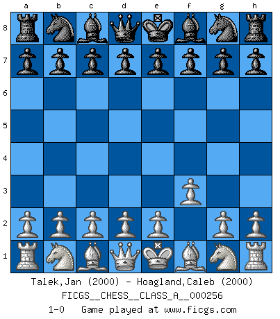 Last move : 1-0 2022 March 21 23:35:4 [Event "FICGS__CHESS__CLASS_A__000256"] [Site "FICGS"] [Date "2022.02.09"] [Round "1"] [White "Talek,Jan"] [Black "Hoagland,Caleb"] [Result "1-0"] [WhiteElo "2000"] [BlackElo "2000"] 1.f3 1-0 This chess game has been lost on time (started : 2022.02.09 13:56:0) Gedult's Opening Player White won this chess game. Follow this game move after move (download)As one by one I mowed them down, my superiority soon became apparent. (Jose Capablanca) Frage des Reporters: -Welche besonderen Umstände rechtfertigen das Anhalten der Uhren während einer Turnierpartie? Antwort: -Einen Fotographen zu strangulieren. (Siegbert Tarrasch) La captura del Rey enemigo es la finalidad pero no el primer objetivo de la partida. (William Steinitz) Le succès, c'est être capable d'aller d'échec en échec sans perdre son enthousiasme. (Winston Churchill) I take risks, sometimes patients die, but not taking risks causes more patients to die. So I guess my biggest problem is I've been cursed with the ability to do the math. (Gregory House, House M.D.)