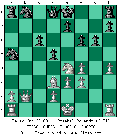 Last move : 0-1 2022 June 4 12:19:27 [Event "FICGS__CHESS__CLASS_A__000256"] [Site "FICGS"] [Date "2022.02.09"] [Round "1"] [White "Talek,Jan"] [Black "Rosabal,Rolando"] [Result "0-1"] [WhiteElo "2000"] [BlackElo "2191"] 1.f4 Nf6 2.c4 b5 3.cxb5 Bb7 4.e3 a6 5.Nf3 g6 6.Nc3 Bg7 7.b4 axb5 8.Bxb5 Nd5 9.Bb2 Nxb4 10.Qb3 Bxf3 11.gxf3 N4c6 12.Ne4 Na5 13.Qc2 Bxb2 14.Qxb2 f6 15.h4 c6 16.Bd3 d5 0-1 Bird's Opening Player Black won this chess game. Follow this game move after move (download)Play the opening like a book, the middle game like a magician, and the endgame like a machine. (Spielmann) Ein Großmeister muß tausende Partien in seinem Kopf speichern, denn diese sind für Ihn, was die Worte der Muttersprache für gewöhnliche Leute sind, oder Noten für Musiker... (Garry Kasparov) Si el Ajedrez es una ciencia, es la mas inexacta. Si el Ajedrez es un arte, es demasiado inexacto para ser visto como tal. Si el Ajedrez es un deporte, es demasiado esotérico. Si el Ajedrez es un juego, es demasiado exigente para ser solo un juego. Si el Ajedrez es una aventura, es una muy demandante. Si el Ajedrez es una pasión, es una muy gratificante. Si el Ajedrez es la vida, es una muy triste. (Anónimo) Shah mat. Le roi est mort. Cri de fierté d'un joueur venant de terrasser son adversaire, courtoisement, sans effusion de sang. There is a great deal of difference between an eager man who wants to read a book and a tired man who wants a book to read. (G.K. Chesterton)