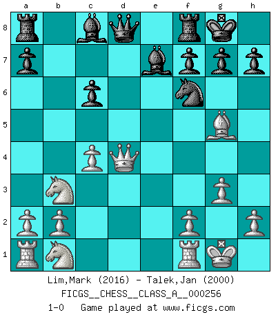Last move : 1-0 2022 June 7 18:57:12 [Event "FICGS__CHESS__CLASS_A__000256"] [Site "FICGS"] [Date "2022.02.09"] [Round "1"] [White "Lim,Mark"] [Black "Talek,Jan"] [Result "1-0"] [WhiteElo "2016"] [BlackElo "2000"] 1.d4 d5 2.Nf3 e6 3.g3 c5 4.Bg2 cxd4 5.Nxd4 Nf6 6.c4 e5 7.Nb3 d4 8.O-O Nc6 9.Bg5 Be7 10.e3 O-O 11.exd4 exd4 12.Bxc6 bxc6 13.Qxd4 1-0 Queen's pawn game Kingside Castling by player White (move 8) Kingside Castling by player Black (move 10) Player White won this chess game. Follow this game move after move (download)I'd rather have a Pawn than a finger. (Reuben Fine) Das Schach ist nichts für kleine Geister, es beansprucht einen vollen Mann, der sich nicht sklavisch an das Überlieferte hält, sondern selbständig die Tiefen des Spiels zu ergründen sucht. (Wilhelm Steinitz) Cualquier cambio de material en una posición debe venir por medio de un mate, una captura o promoción de Peón. (Purdy) La vie est comme un jeu d'échecs : nous esquissons un plan, mais celui-ci est tributaire de ce que daignent faire l'adversaire aux échecs et le destin dans la vie. (Arthur Schopenhauer) Players are not good because they find tactics, it is about the way to find the positions in which those tactics are hidden. (Luc-Olivier Leclerc)
