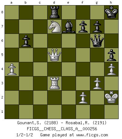 Last move : 1/2-1/2 2022 July 14 20:31:27 [Event "FICGS__CHESS__CLASS_A__000256"] [Site "FICGS"] [Date "2022.02.09"] [Round "1"] [White "Gounant,Stanislas"] [Black "Rosabal,Rolando"] [Result "1/2-1/2"] [WhiteElo "2188"] [BlackElo "2191"] 1.d4 Nf6 2.c4 e6 3.g3 d5 4.Nf3 c6 5.Bg2 dxc4 6.Ne5 Bb4+ 7.Bd2 Be7 8.e3 O-O 9.Nxc4 b6 10.O-O Bb7 11.b4 Nbd7 12.a4 Qc8 13.Qb3 h5 14.Nc3 Rd8 15.e4 c5 16.bxc5 bxc5 17.d5 exd5 18.exd5 Nb6 19.Nxb6 axb6 20.Bg5 Qf5 21.h4 Bd6 22.Bxf6 Qxf6 23.Ne4 Qg6 24.Rfe1 Be5 25.Nxc5 Bxd5 26.Bxd5 Bxa1 27.Bxa8 Rxa8 28.Qd5 Rc8 29.Nd7 Bb2 30.Re3 Bf6 31.Re4 Rd8 32.Kh2 Kh7 33.Re3 Kh8 34.Rb3 Be7 35.Re3 Bf6 36.Rd3 Be7 1/2-1/2 Catalan Opening Kingside Castling by player Black (move 8) Kingside Castling by player White (move 10) This chess game ended in a draw. Follow this game move after move (download)There is no remorse like the remorse of Chess. (H. G. Wells) Es gibt nur zwei wahre Schachgenies - das andere war Wilhelm Steinitz, der Weltmeister von 1872 bis 1894. (Robert James Fischer) El Ajedrez es el gimnasio de la mente. (Blaise Pascal) La vie et les Echecs sont tous les deux une lutte constante. (Lasker) The Internet is the first thing that humanity has build that humanity doesn't understand, the largest experiment in anarchy that we have ever had. (Eric Schmidt)