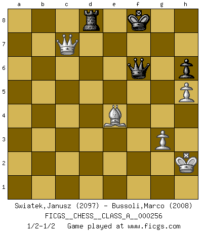Last move : 1/2-1/2 2022 April 6 20:25:17 [Event "FICGS__CHESS__CLASS_A__000256"] [Site "FICGS"] [Date "2022.02.09"] [Round "1"] [White "Swiatek,Janusz"] [Black "Bussoli,Marco"] [Result "1/2-1/2"] [WhiteElo "2097"] [BlackElo "2008"] 1.d4 Nf6 2.c4 e6 3.Nf3 b6 4.g3 Be7 5.Bg2 O-O 6.O-O Bb7 7.d5 exd5 8.Nh4 c6 9.cxd5 Nxd5 10.Nf5 Nc7 11.e4 d5 12.Nc3 Bf6 13.exd5 Nxd5 14.Nxd5 cxd5 15.Bf4 Bxb2 16.Rb1 Bf6 17.Ne3 Bg5 18.Bxg5 Qxg5 19.Nxd5 Na6 20.h4 Qd8 21.Nf6+ Qxf6 22.Bxb7 Rad8 23.Qa4 Nc5 24.Qxa7 Rd6 25.Bg2 Rfd8 26.h5 g5 27.a4 Nd3 28.a5 bxa5 29.Qxa5 h6 30.Rb5 Re8 31.Rf5 Qe6 32.Qb5 Ne5 33.f4 gxf4 34.R1xf4 Rd2 35.Bh3 Rd5 36.Qa4 Qb6+ 37.Kh1 Re7 38.Rf6 Rd6 39.Rxd6 Qxd6 40.Bf1 Qe6 41.Kh2 Rd7 42.Qe4 Kg7 43.Kg1 Qb6+ 44.Kh2 Rd2+ 45.Bg2 Qe6 46.Rxf7+ Qxf7 47.Qxe5+ Qf6 48.Qc7+ Kg8 49.Qc1 Rd8 50.Be4 Qe6 51.Qe3 Kg7 52.Qc3+ Qf6 53.Qc7+ Kf8 1/2-1/2 Queen's Indian : 4.g3 Kingside Castling by player Black (move 5) Kingside Castling by player White (move 6) 10 pieces endgame at move 46 : White KQBPP , Black KQRNP WHITE : King + 1 Queen 1 Bishop 2 Pawns BLACK : King + 1 Queen 1 Rook 1 Knight 1 Pawn 9 pieces endgame at move 47 : White KQBPP , Black KQRP WHITE : King + 1 Queen 1 Bishop 2 Pawns BLACK : King + 1 Queen 1 Rook 1 Pawn This chess game ended in a draw. Follow this game move after move (download)The way he plays Chess demonstrates a man's whole nature. (Stanley Ellin) Ich kenne Menschen, die allen Willen der Welt besitzen und doch nicht Schach spielen können. (Robert James Fischer) ¿Esta Bobby Fischer algo cuerdo?. (Salo Flohr) Comme les marins qui ont mille raisons différentes d'aller en mer, les joueurs d'échecs en ont tout autant avant de s'installer devant une table et jouer... (Vincent Bertignac, philosophe) The difference between perseverance and obstinacy is that one comes from a strong will, and the other from a strong won't. (Henry Ward Beecher)
