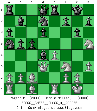 Last move : 0-1 2007 October 12 13:15:37 [Event "FICGS__CHESS__CLASS_A__000025"] [Site "FICGS"] [Date "2007.07.29"] [Round "1"] [White "Pagano,Marcelo"] [Black "Marin Millan,Jose Antonio"] [Result "0-1"] [WhiteElo "2003"] [BlackElo "2088"] 1.e4 e5 2.Nf3 Nc6 3.Bb5 a6 4.Ba4 Nf6 5.O-O Be7 6.Re1 b5 7.Bb3 O-O 8.c3 d6 9.h3 Bb7 10.d4 Re8 11.Nbd2 exd4 12.cxd4 Nd7 13.Nf1 Bf6 14.Ng3 Na5 15.Bc2 g6 16.Qd3 c5 17.Nh5 Bxd4 0-1 Ruy Lopez : Closed, 7...O-O Kingside Castling by player White (move 5) Kingside Castling by player Black (move 7) Player Black won this chess game. Follow this game move after move (download)Chess is ruthless: you've got to be prepared to kill people. (Nigel Short) Habe Mut, dich deines eigenen Verstandes zu bedienen. (Immanuel Kant) ¿Que sería del Ajedrez sin errores graciosos?. (Kurt Richter) Que feriez-vous si vous étiez en train de jouer aux échecs et que la fin du monde arrive ? Je continuerais à jouer. (Saint Borromée) Think like a man of action, act like a man of thought. (Henri Louis Bergson)