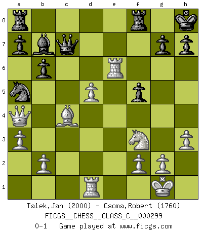 Last move : 0-1 2022 June 4 12:19:27 [Event "FICGS__CHESS__CLASS_C__000299"] [Site "FICGS"] [Date "2022.02.12"] [Round "1"] [White "Talek,Jan"] [Black "Csoma,Robert"] [Result "0-1"] [WhiteElo "2000"] [BlackElo "1760"] 1.h3 f5 2.d4 Nf6 3.Bf4 e6 4.e3 Be7 5.Nf3 O-O 6.Be2 d5 7.c4 c5 8.O-O Nc6 9.dxc5 Bxc5 10.Nc3 b6 11.cxd5 Nxd5 12.Nxd5 exd5 13.a3 d4 14.Qa4 Bb7 15.Rad1 Qe7 16.exd4 Bd6 17.Rfe1 Qc7 18.Bc4+ Kh8 19.Bxd6 Qxd6 20.Re6 Qc7 21.d5 Na5 0-1 Clemenz (Mead's, Basman's or de Klerk's) Opening Kingside Castling by player Black (move 5) Kingside Castling by player White (move 8) Player Black won this chess game. Follow this game move after move (download)It is not a move, even the best move that you must seek, but a realizable plan. (Eugene Znosko-Borovsky) Dass jemand wie Surab Asmaiparaschwili, der selbst Elopunkte gekauft hat , Vize-Präsident der Fide werden konnte, sagt schon einges über den Zustand dieser Organisation aus. (Joel Lautier) Todo se encuentra en un estado de flujo y esto incluye al mundo del Ajedrez. (Mikhail Botvinnik) On est toujours la mazette de quelqu'un d'autre. (Anonyme) Convictions are more dangerous enemies of truth than lies. (Friedrich Nietzsche)