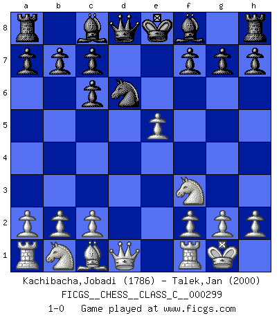 Last move : 1-0 2022 May 13 18:55:26 [Event "FICGS__CHESS__CLASS_C__000299"] [Site "FICGS"] [Date "2022.02.12"] [Round "1"] [White "Kachibacha,Jobadi"] [Black "Talek,Jan"] [Result "1-0"] [WhiteElo "1786"] [BlackElo "2000"] 1.e4 e5 2.Nf3 Nc6 3.Bb5 Nf6 4.O-O Nxe4 5.d4 Nd6 6.Bxc6 dxc6 7.dxe5 1-0 This chess game has been lost on time (started : 2022.02.12 13:12:32) Ruy Lopez : Berlin defense, Open variation Kingside Castling by player White (move 4) Player White won this chess game. Follow this game move after move (download)Mistrust is the most necessary characteristic of the Chess player. (Siegbert Tarrasch) Über die Verhaftung Bobby Fischers: Warum es die Bush-Administration für nötig befindet einen 61 Jahre alten Mann zu hetzten, der für niemanden ausser sich selbste eine Gefahr darstellt ist ein Rätsel. (Nigel Short) Un Peón pasado aumenta su poder a medida de que el número de piezas en el tablero disminuye. (Capablanca) Tout change constamment, y compris dans le monde des Echecs. (Botvinnik) The quality of decision is like the well-timed swoop of a falcon which enables it to strike and destroy its victim. (Sun Tzu)