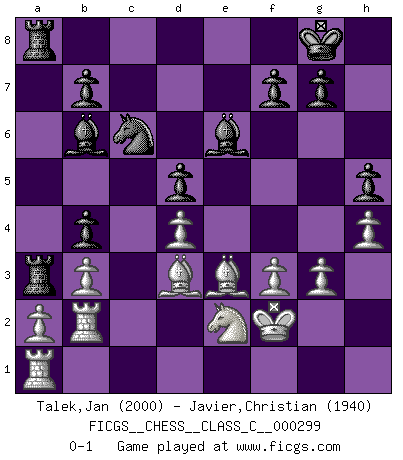 Last move : 0-1 2022 June 5 16:6:33 [Event "FICGS__CHESS__CLASS_C__000299"] [Site "FICGS"] [Date "2022.02.12"] [Round "1"] [White "Talek,Jan"] [Black "Javier,Christian"] [Result "0-1"] [WhiteElo "2000"] [BlackElo "1940"] 1.h4 d5 2.d4 c5 3.e3 Nf6 4.c4 cxd4 5.exd4 Bg4 6.f3 Bd7 7.Nc3 e6 8.cxd5 Nxd5 9.Nxd5 exd5 10.Bg5 Qb6 11.Qe2+ Be6 12.Qb5+ Nc6 13.Qxb6 axb6 14.Ne2 b5 15.Kf2 b4 16.Be3 Bd6 17.Nc1 O-O 18.Bd3 h5 19.Ne2 Rfc8 20.Rhb1 Ra4 21.b3 Ra5 22.Rb2 Rca8 23.Bg5 Bc7 24.g3 Bb6 25.Be3 Ra3 0-1 Anti-Borg (Desprez) Opening Kingside Castling by player Black (move 17) Player Black won this chess game. Follow this game move after move (download)A thorough understanding of the typical mating continuations makes the most complicated sacrificial combinations leading up to them not only not difficult, but almost a matter of course. (Siegbert Tarrasch) Ein Schachspiel besteht aus drei Phasen: Die erste, wenn du hofftst den Vorteil zu haben, die zweite, wenn du glaubst einen Vorteil zu haben, und die dritte.... wenn du weißt Du wirst verlieren. (Savielly Grigorievitsch Tartakower) Solo puedes ser bueno en el Ajedrez si amas al juego. (Bobby Fischer) La conception d'un plan est le processus par lequel un joueur exploite les avantages de sa position tout en s'efforçant d'en réduire au minimum les inconvénients. Afin de garantir le succès, un plan doit toujours se fonder sur un diagnostic objectif des particularités d'une position. La conception d'un plan est d'autant plus difficile que la position est équilibrée, et grandement facilitée lorsqu'il n'existe qu'un seul plan susceptible de répondre aux exigences de la position. (Harry Golombek) Creativity is inventing, experimenting, growing, taking risks, breaking rules, making mistakes, and having fun. (Mary Lou Cook)