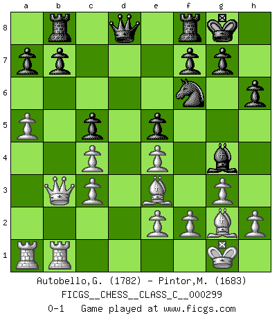 Last move : 0-1 2022 May 6 14:10:17 [Event "FICGS__CHESS__CLASS_C__000299"] [Site "FICGS"] [Date "2022.02.12"] [Round "1"] [White "Autobello,Giovanni"] [Black "Pintor,Manuel"] [Result "0-1"] [WhiteElo "1782"] [BlackElo "1683"] 1.c4 e5 2.Nc3 Bc5 3.Nf3 Qf6 4.g3 d6 5.Nd5 Qd8 6.d3 c6 7.Nc3 Nf6 8.Bg5 O-O 9.Bg2 Bb4 10.O-O Bxc3 11.bxc3 Bg4 12.a4 Nbd7 13.a5 h6 14.Be3 c5 15.Qb3 Rb8 16.Rfb1 e4 17.dxe4 Ne5 18.Nxe5 dxe5 0-1 This chess game has been lost on time (started : 2022.02.12 13:12:32) English Opening Kingside Castling by player Black (move 8) Kingside Castling by player White (move 10) Player Black won this chess game. Follow this game move after move (download)Many have become Chess Masters, no one has become the Master of Chess. (Siegbert Tarrasch) Ein Remis kann durch Wiederholung von drei Zügen oder durch einen schlechte Zug erreicht werden. (Savielly Grigorievitsch Tartakower) Nunca antes ha habido un jugador de Ajedrez con tal conocimiento a fondo de las complejidades del juego y una inmensa voluntad absolutamente indomable de ganar. Yo pienso que Fischer es el jugador mas grande que jamás haya existido. (Lisa Lane) Aux échecs, les retours au sommet sont rares : les dommages psychologiques consécutifs à une défaite sont trop sévères. (Daily Telegraph) Memory is a complicated thing, a relative to truth, but not its twin. (Barbara Kingsolver, Animal Dreams)