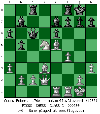 Last move : 1-0 2022 June 12 7:55:26 [Event "FICGS__CHESS__CLASS_C__000299"] [Site "FICGS"] [Date "2022.02.12"] [Round "1"] [White "Csoma,Robert"] [Black "Autobello,Giovanni"] [Result "1-0"] [WhiteElo "1760"] [BlackElo "1782"] 1.e4 c5 2.Nf3 d6 3.d4 cxd4 4.Nxd4 Nf6 5.Nc3 a6 6.Be2 e6 7.O-O Be7 8.Be3 O-O 9.Qd2 Qc7 10.h3 Nc6 11.f4 b5 12.a3 Bb7 13.Bd3 Nxd4 14.Bxd4 Rac8 15.e5 dxe5 16.Bxe5 Qc6 17.Rae1 Nd5 18.Nxd5 1-0 This chess game has been lost on time (started : 2022.02.12 13:12:32) Sicilian : Najdorf, Opovcensky variation Kingside Castling by player White (move 7) Kingside Castling by player Black (move 8) Player White won this chess game. Follow this game move after move (download)I believe that Chess possesses a magic that is also a help in advanced age. A rheumatic knee is forgotten during a game of Chess and other events can seem quite unimportant in comparison with a catastrophe on the chessboard. (Vlastimil Hort) Ivan Sokolov treibt mich als Beifahrer an mit go Loeky go - . (Loek van Wely) El Rey es una pieza de pelea. ¡Usenlo!. (Wilhelm Steinitz) Les Echecs sont et restent toujours un combat, un combat intégral comme la boxe, la lutte ou un autre sport, et où il doit y avoir un vainqueur et un vaincu. (Joseph Emil Diemer) My poor ole parrot... Is not in the circulation of displays ....poo hoo hoo :) (Wayne Lowrance's enigma)