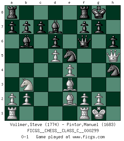 Last move : 0-1 2022 February 17 17:15:47 [Event "FICGS__CHESS__CLASS_C__000299"] [Site "FICGS"] [Date "2022.02.12"] [Round "1"] [White "Vollmer,Steve"] [Black "Pintor,Manuel"] [Result "0-1"] [WhiteElo "1774"] [BlackElo "1683"] 1.e4 e5 2.Nf3 Nc6 3.Bb5 Qf6 4.c3 Bc5 5.O-O Nge7 6.d3 h6 7.Nbd2 O-O 8.Nb3 Bb6 9.d4 exd4 10.cxd4 d6 11.h3 Qg6 12.Bd3 Bxh3 13.Nh4 Qf6 14.Qh5 Bd7 15.d5 Ne5 16.Be2 N7g6 17.Be3 Nxh4 0-1 Ruy Lopez (Spanish Opening) Kingside Castling by player White (move 5) Kingside Castling by player Black (move 7) Player Black won this chess game. Follow this game move after move (download)Chess is a matter of delicate judgment, knowing when to punch and how to duck. (Bobby Fischer) Ein Gewinn durch eine ungenaue Kombination, sei sie auch noch so vorzeigbar, erfüllt mich mit Schaudern. (Wilhelm Steinitz) El ganar no lo es todo... pero el perder es nada. (Mednis) La vérité est comme le meilleur coup aux échecs : elle existe, mais il faut la chercher. (Arturo Perez-Reverte) Creativity is allowing yourself to make mistakes. Art is knowing which ones to keep. (Scott Adams)