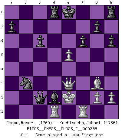 Last move : 0-1 2022 July 30 14:41:49 [Event "FICGS__CHESS__CLASS_C__000299"] [Site "FICGS"] [Date "2022.02.12"] [Round "1"] [White "Csoma,Robert"] [Black "Kachibacha,Jobadi"] [Result "0-1"] [WhiteElo "1760"] [BlackElo "1786"] 1.d4 Nf6 2.Nc3 d5 3.Bg5 Nbd7 4.Qd3 c6 5.e4 dxe4 6.Nxe4 Nxe4 7.Qxe4 Qb6 8.O-O-O Qa5 9.Nf3 Qxa2 10.b3 h6 11.Bh4 e6 12.d5 Ba3+ 13.Kd2 Nc5 14.Qe3 Bb4+ 15.Ke2 Qxc2+ 16.Nd2 f6 17.dxc6 bxc6 18.Bg3 Ba6+ 19.Ke1 Bxf1 20.Rxf1 Rd8 21.Ke2 e5 22.f4 Nxb3 23.fxe5 Bxd2 0-1 Queen's pawn game Queenside Castling by player White (move 8) Player Black won this chess game. Follow this game move after move (download)Fischer, who may or may not be mad as a hatter, has every right to be horrified. (Jeremy Silman) Darum geht es im Schach. Einen Tag gibst du deinem Gegner eine Lektion, am nächsten Tag gibt er dir eine. (Robert James Fischer) El Ajedrez detiene a su maestro dentro de sus propios vínculos, encadenando la mente y el cerebro, por lo que la libertad interior del mas fuerte debe sufrir. (Albert Einstein) Nous sommes les pions de la mystérieuse partie d'Echecs jouée par Dieu. Il nous déplace, nous arrête, nous pousse encore, puis nous lance un à un dans la boîte du Néant. Epitaphe sur la tombe de David Janowsky (1868-1927). They misunderestimated me. (George W. Bush, Bentonville nov. 6, 2000)