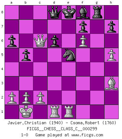 Last move : 1-0 2022 May 17 23:0:57 [Event "FICGS__CHESS__CLASS_C__000299"] [Site "FICGS"] [Date "2022.02.12"] [Round "1"] [White "Javier,Christian"] [Black "Csoma,Robert"] [Result "1-0"] [WhiteElo "1940"] [BlackElo "1760"] 1.e4 c5 2.Nf3 d6 3.d4 cxd4 4.Nxd4 Nf6 5.Nc3 e6 6.g4 e5 7.Nf5 Bxf5 8.exf5 Be7 9.g5 Nfd7 10.h4 Nc6 11.Be3 Rc8 12.Qd2 Qa5 13.O-O-O a6 14.Kb1 b5 15.h5 Nb6 16.f6 gxf6 17.Bxb6 Qxb6 18.gxf6 Bf8 19.Bh3 Rc7 20.Nd5 Qb7 21.Nxc7+ Qxc7 22.Qd5 Nd8 23.Rhe1 Nc6 24.f4 Rg8 25.fxe5 Nxe5 26.Qa8+ Qd8 27.Qc6+ 1-0 Sicilian : Scheveningen, Keres attack Queenside Castling by player White (move 13) Player White won this chess game. Follow this game move after move (download)The sign of a great Master is his ability to win a won game quickly and painlessly. (Irving Chernev) Wenn ich einen Club besuche, sind die Spieler stumm vor Staunen. (José Raúl Capablanca) Vive, pierde y aprende al observar a tu oponente como ganar. (Amber Steenbock) On a dit que l'homme se distingue de l'animal par le fait qu'il achète plus de livres qu'il ne peut en lire. Je voudrais suggérer qu'inclure à la liste des livres quelques livres d'échecs rendrait la distinction manifeste. (Edward Lasker) Depression is just anger without enthusiasm. (Unknown)