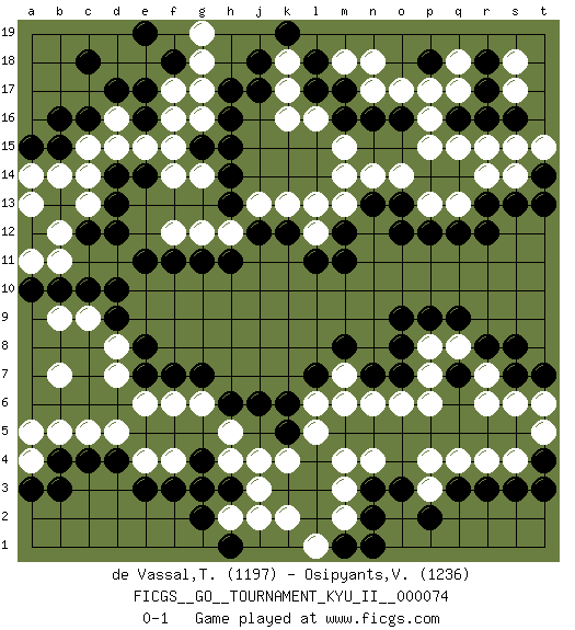 Last move : 0-1 2022 July 4 1:25:47 [Event "FICGS__GO__TOURNAMENT_KYU_II__000074"] [Site "FICGS"] [Date "2022.02.14"] [Round "1"] [Black "de Vassal,Thibault"] [White "Osipyants,Vladimir"] [Result "0-1"] [Rating 1 "1197"] [Rating 2 "1236"] 1.d4 q4 2.d17 q17 3.o3 m4 4.q3 r4 5.r3 p4 6.s3 s4 7.t4 t5 8.t3 s6 9.n3 n4 10.q9 q8 11.p9 p8 12.o9 r14 13.o8 p6 14.o7 o6 15.d10 d7 16.f3 c5 17.c4 c9 18.c10 k16 19.h16 k13 20.h13 m3 21.n2 p3 22.p2 j3 23.o12 o14 24.l11 m14 25.j17 k17 26.l7 c15 27.c16 d15 28.d13 b12 29.b10 b9 30.b15 b14 31.b16 c13 32.d12 d16 33.e17 f15 34.g15 f16 35.j18 f17 36.f18 g18 37.e19 f14 38.e11 g14 39.h14 f12 40.g11 g12 41.h11 h12 42.j12 j13 43.l18 k18 44.k19 g16 45.h15 n18 46.m17 n17 47.m16 m15 48.n16 p16 49.o16 o17 50.d14 c14 51.e16 e15 52.h17 g17 53.f11 a13 54.c12 m18 55.l17 l16 56.e14 a11 57.a10 b11 58.d9 b7 59.e7 d5 60.h6 e6 61.f7 e4 62.e3 f4 63.b4 b5 64.r12 g19 65.c18 n6 66.s13 s14 67.t14 t15 68.t13 r15 69.h3 j4 70.g4 d8 71.e8 f6 72.k12 l13 73.r8 r7 74.a15 a14 75.q7 p7 76.s7 r6 77.s8 m2 78.m1 l1 79.n1 k2 80.r13 p13 81.p12 q13 82.q12 l12 83.m11 g6 84.g7 h5 85.j6 a4 86.a3 a5 87.b3 h2 88.g2 h4 89.g3 m7 90.m8 l6 91.k6 l5 92.n7 m6 93.h1 j2 94.m12 m13 95.p18 p17 96.s16 s15 97.r18 s17 98.r17 s18 99.r16 q18 100.q16 q15 101.o13 p15 102.n13 n14 103.t7 t6 104.k5 k4 0-1 Here are the names of the openings (joseki) played in the four corners : Corner q4 : q4 o3 Hoshi (Hwajeom, Seongjeom, Xingwei`) 4-4 Point. The star or hoshi (4-4) point, emphasizing influence at the potential expense of territory. Ikken Kakari (Hankan Keolch'im, Yi Gua`jiao~, 1-Space Low Approach). Black 2 is the standard approach move to the 4-4. Corner d4 : d4 d7 Hoshi (Hwajeom, Seongjeom, Xingwei`) 4-4 Point. The star or hoshi (4-4) point, emphasizing influence at the potential expense of territory. Niken Takagakari (Dukan Nop'dakeolch'im, E`r Gaojia, 2-Space High Approach). White 2 is a light approach move. Rarely played in even games, White 2 is typically employed in handicap games. Black continues with 6-4 or 3-10. In Korean Sunjang Baduk Black has a stone on 8-4. Player White won this Go (weiqi, baduk) game. Follow this game move after move (download)There is death in the hane. (Anonymous) Fortune favours the audacious. (Desiderius Erasmus)