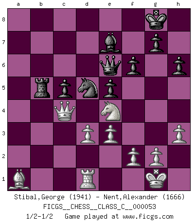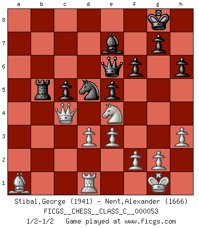 Last move : 1/2-1/2 2007 September 18 15:59:49 [Event "FICGS__CHESS__CLASS_C__000053"] [Site "FICGS"] [Date "2007.07.29"] [Round "1"] [White "Stibal,George"] [Black "Nent,Alexander"] [Result "1/2-1/2"] [WhiteElo "1941"] [BlackElo "1666"] 1.c4 c5 2.Nf3 Nc6 3.Nc3 e5 4.e3 Nf6 5.a3 d5 6.cxd5 Nxd5 7.Qc2 Nxc3 8.bxc3 Bd6 9.Bc4 O-O 10.Rb1 Rb8 11.O-O Qf6 12.Bd5 h6 13.d3 Ne7 14.Be4 Qe6 15.Nd2 b5 16.Bb2 Bb7 17.c4 a6 18.Rfd1 Rfc8 19.cxb5 axb5 20.a4 bxa4 21.Qxa4 Bxe4 22.Nxe4 Nd5 23.Ba1 Be7 24.Rxb8 Rxb8 25.Qc4 Rb4 26.Qc2 Rb5 27.h3 f6 28.Qc4 Rb4 29.Qc2 Rb5 30.Qc4 1/2-1/2 English : Symmetrical variation Kingside Castling by player Black (move 9) Kingside Castling by player White (move 11) This chess game ended in a draw. Follow this game move after move (download)If your opponent cannot do anything active, then don't rush the position; instead you should let him sit there, suffer, and beg you for a draw. (Jeremy Silman) Ich moechte nie einem Club beitreten, der Leute wie mich als Mitglieder aufnimmt. (Woody Allen) Una clavada es mas poderosa que una espada. (Fred Reinfeld) Karpov est une pièce de musée. (Garry Kasparov) Life is pleasant. Death is peaceful. It's the transition that's troublesome. (Isaac Asimov)