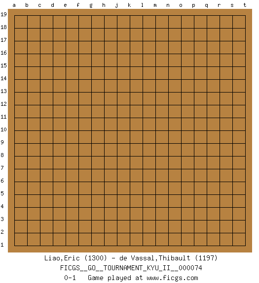 Last move : 0-1 2022 March 17 1:44:33 [Event "FICGS__GO__TOURNAMENT_KYU_II__000074"] [Site "FICGS"] [Date "2022.02.14"] [Round "1"] [Black "Liao,Eric"] [White "de Vassal,Thibault"] [Result "0-1"] [Rating 1 "1300"] [Rating 2 "1197"] 0-1 This go game has been lost on time (started : 2022.02.14 23:51:23) Here are the names of the openings (joseki) played in the four corners : Player White won this Go (weiqi, baduk) game. Follow this game move after move (download)To invade, need 20 points in open area; otherwise, keshi is best. (Yang Yilun, 7p) When you stop learning you start dying. (M. Scott Adams)