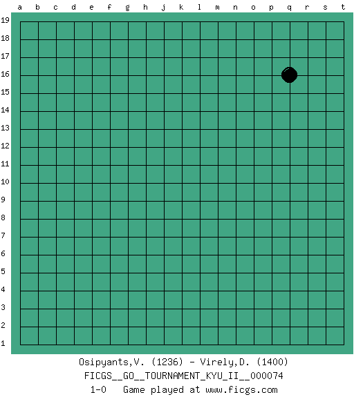 Last move : 1-0 2022 April 3 23:21:6 [Event "FICGS__GO__TOURNAMENT_KYU_II__000074"] [Site "FICGS"] [Date "2022.02.14"] [Round "1"] [Black "Osipyants,Vladimir"] [White "Virely,Daniel Francois"] [Result "1-0"] [Rating 1 "1236"] [Rating 2 "1400"] 1.q16 1-0 This go game has been lost on time (started : 2022.02.14 23:51:23) Here are the names of the openings (joseki) played in the four corners : Player Black won this Go (weiqi, baduk) game. Follow this game move after move (download)You have to like to win, and to learn to recognize the errors that gave you the victory. (Pierre Audouard) Question: Is 'This statement is paradoxical' a paradoxical statement ? Or is it a meta-paradox ? (Normajean Yates)